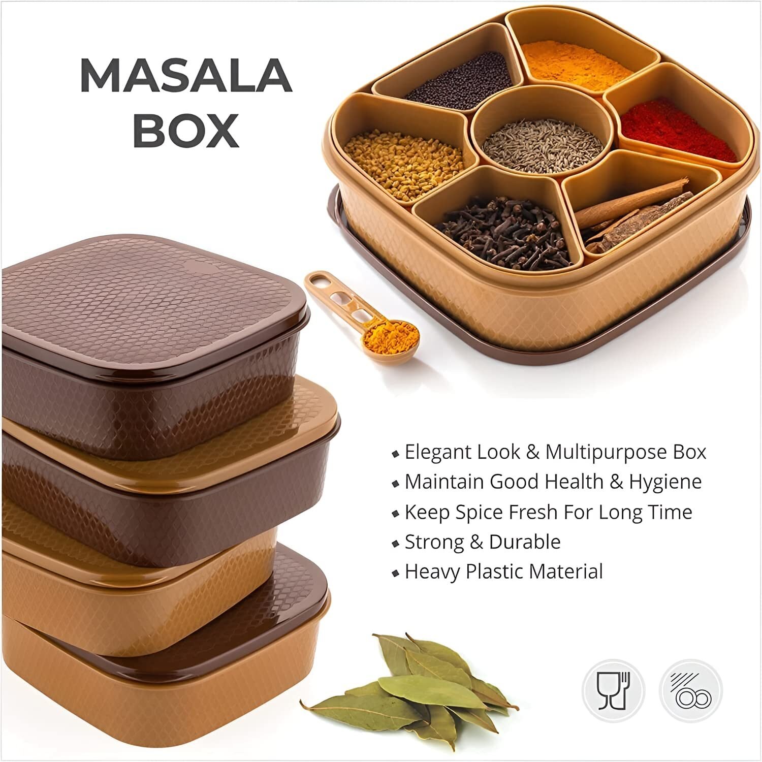 Plastic Square 7 Sections Multipurpose Kitchen Storage Masala Rangoli Dabba Box Set, Spice Box Set – Brown