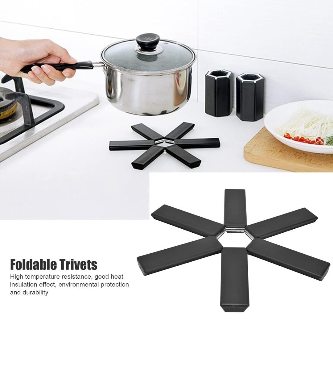 Premium Materials: The folding pot mat is made of food grade ABS and PP materials, making the product strong, non fading, heat resistance up to 230℃.