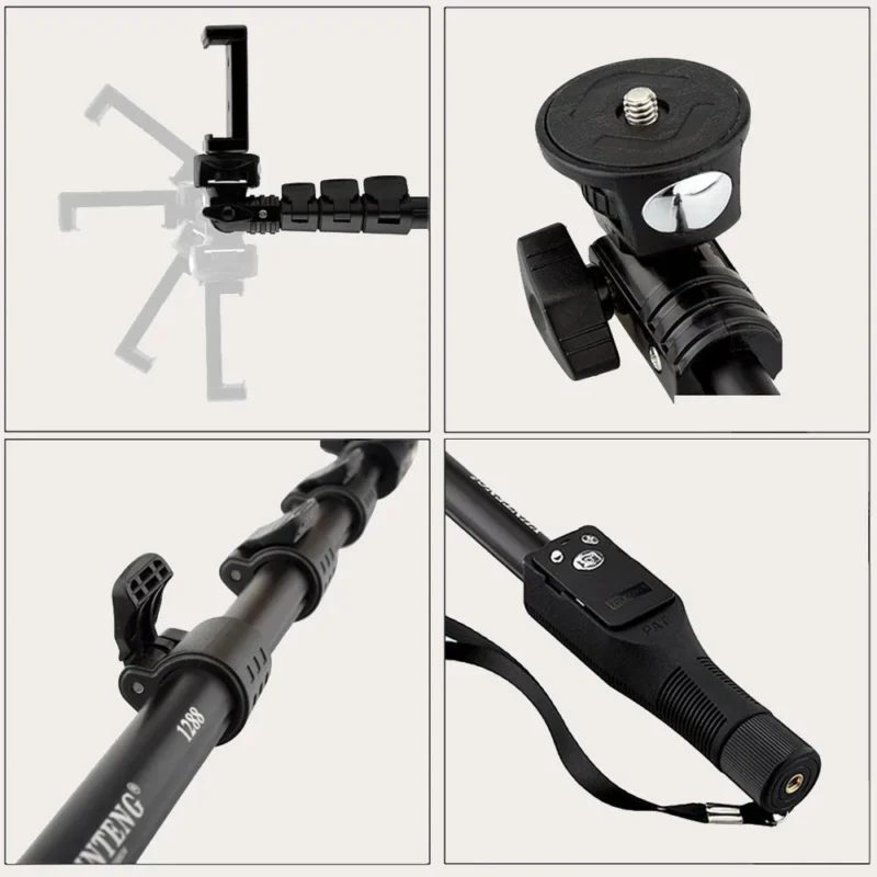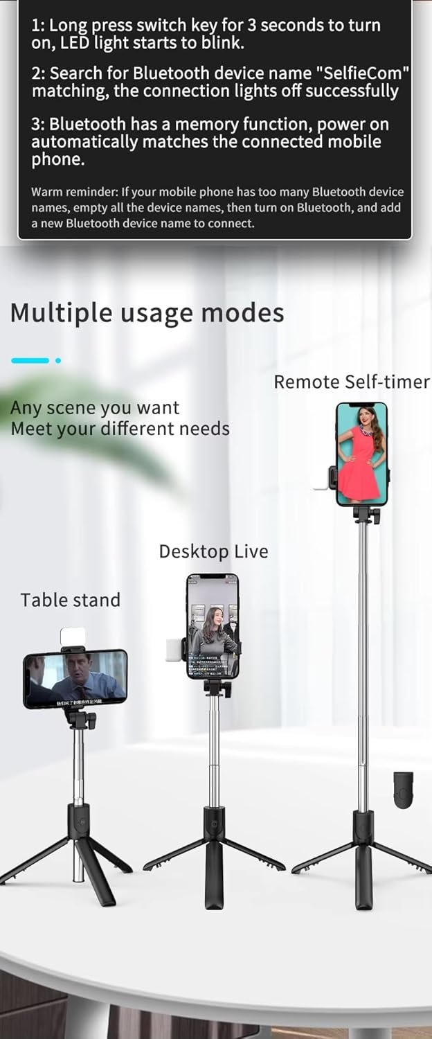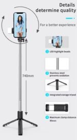 R1S Selfie Stick Tripod, 74cm Extendable, LED Light, Bluetooth Remote, 360° Rotation, Phone Holder